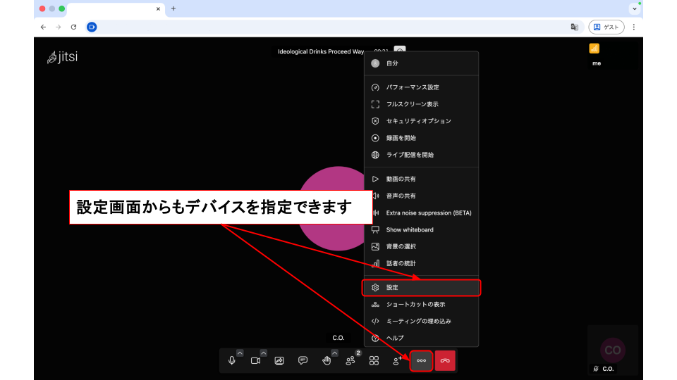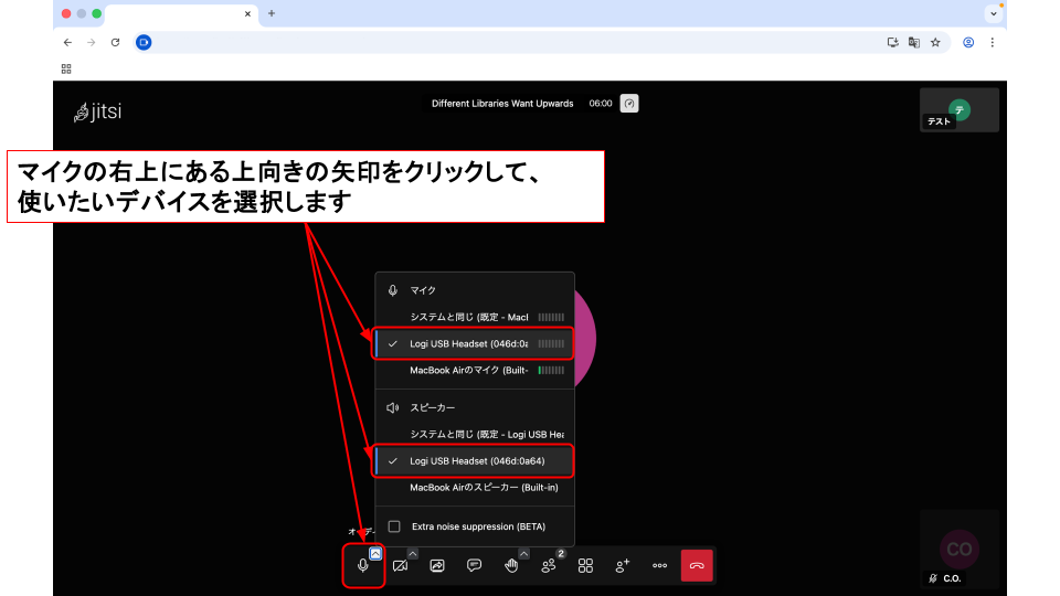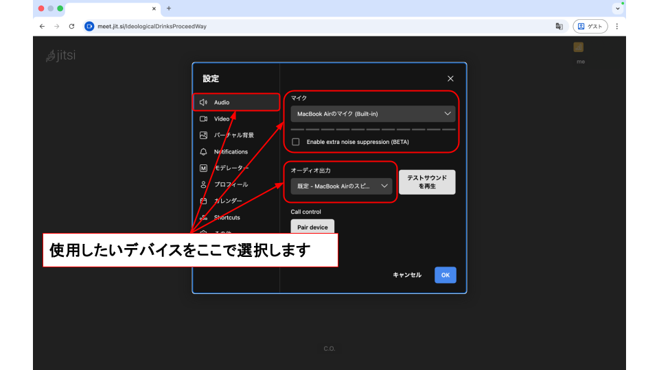 マイク・ボタンの右上にある アイコンをクリックして設定を開き、デバイスを選択します。マイク/スピーカーの両方選択してください。