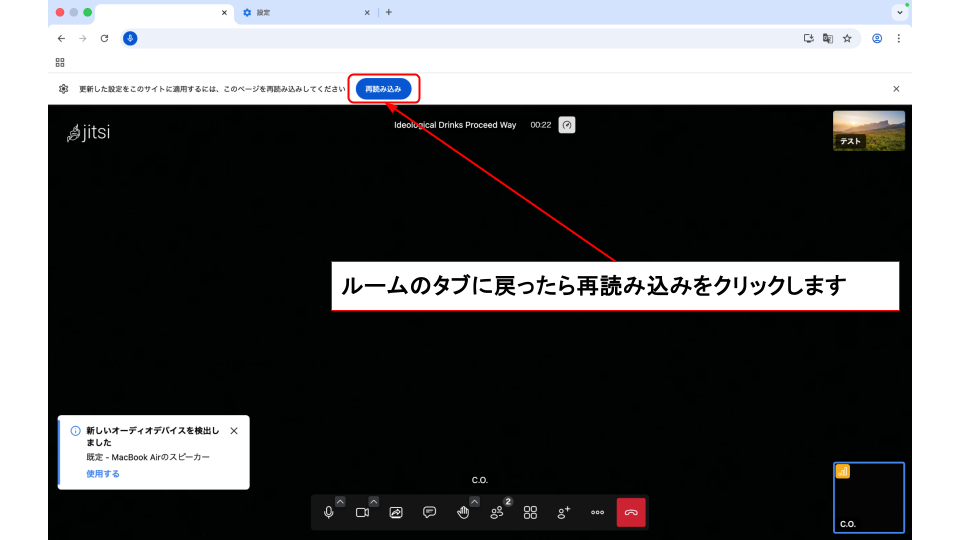 ルームのタブに戻ったら、「再読み込み」ボタンをクリックして設定を反映させましょう!