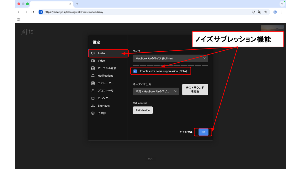 現在(2025/09/28)ではまだベータ版ですが、ノイズサプレッション機能があります。ただし、誤作動でする場合もあるので、音が入らないなど不具合があればチェックを外してリロード、ルームに入り直しましょう。