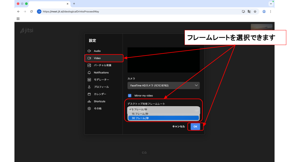 パソコンのスペックやネット速度が不足していてカクつく場合、できるだけフレームレートを下げるようにしましょう。