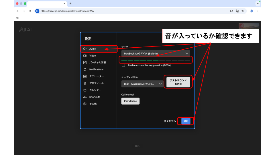 マイクのデバイス名の下にマイクのレベルメーターがあるので、声を吹き込んで反応するか試せます。また、オーディオ出力(スピーカー・デバイス名)の横にある「テストサウンドの再生」をクリックすることで、音が聞こえるかどうかテストすることができます。