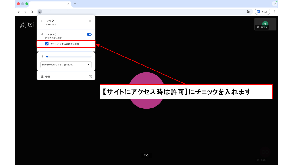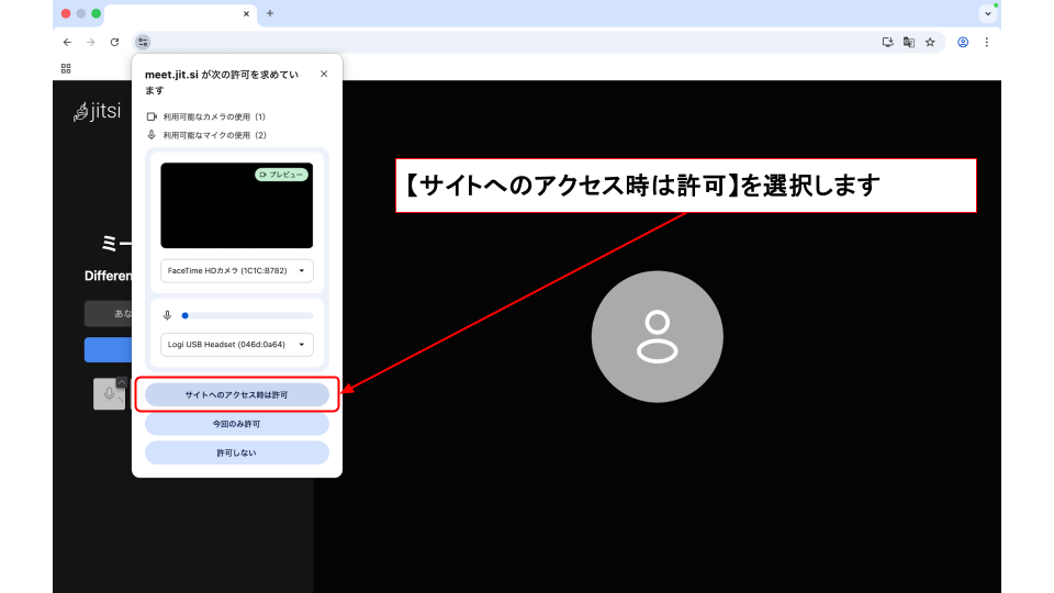 「サイトのアクセス時は許可」を選択するのがおすすめです。 「今回のみ許可」を選んだ場合は次回以降もマイク/カメラの許可操作を行う必要があります!