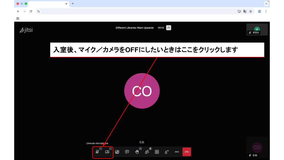 表示が【許可】となっている場合は現在許可できていませんので【許可】をクリックします。 表示が【許可しない】となっている場合は現在も許可できているのでそのままで大丈夫です! もしミュートになっていた場合はマイクアイコンをクリックして解除しましょう。