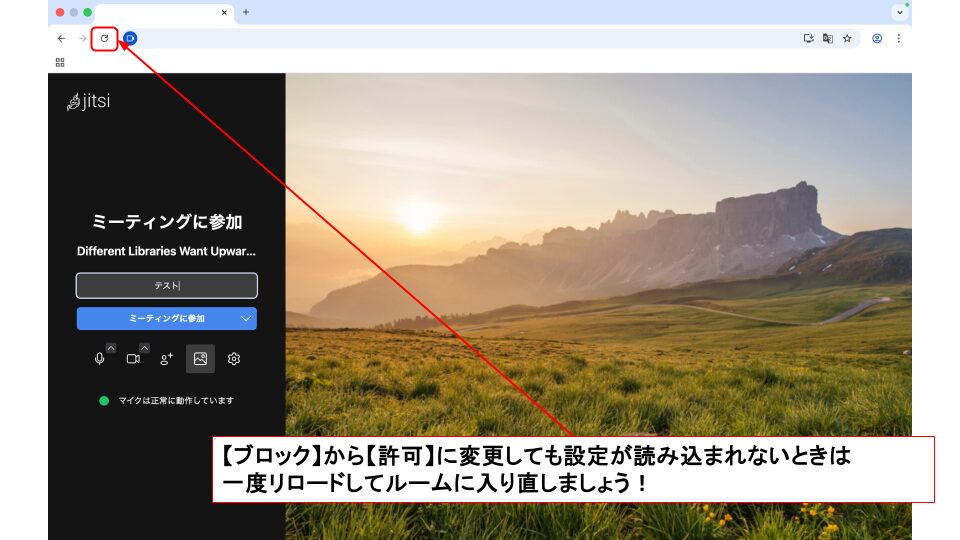 設定を変更してもマイク/カメラをONにできないときは再読み込みボタンを押してルームに再度入室してみましょう。