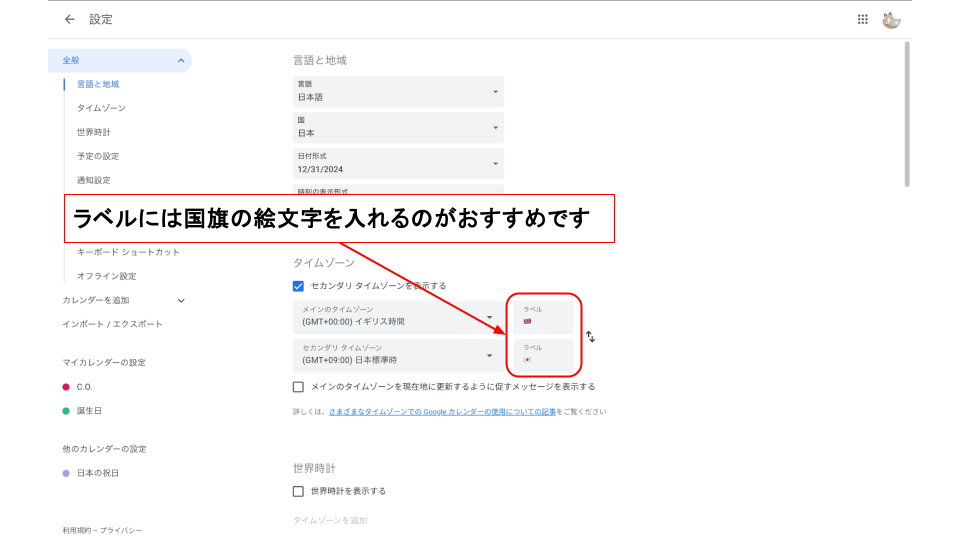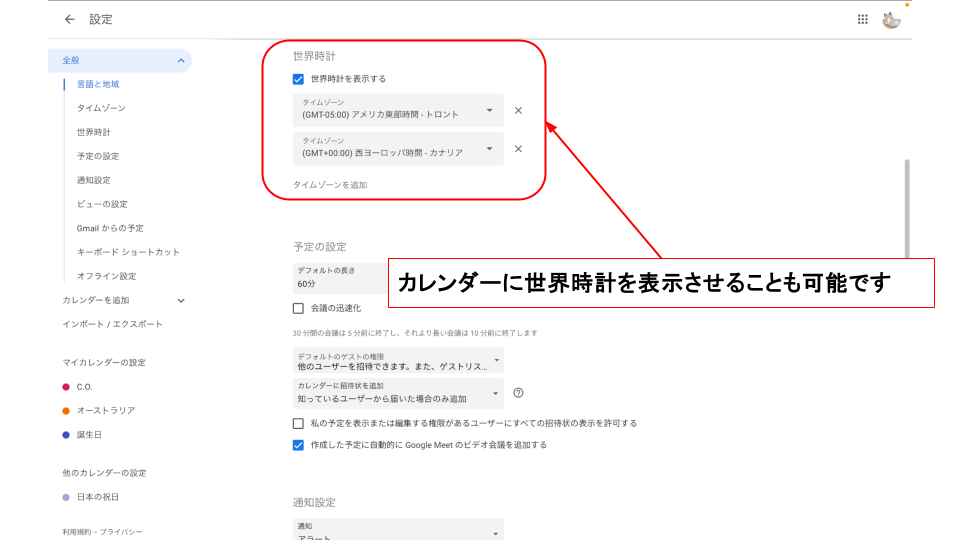 お仕事用のGoogleアカウントを作成し、そちらのメインのタイムゾーンを日本標準時に設定する(プライベートのアカウントでは引き続き現在地をメインのタイムゾーンに設定する)