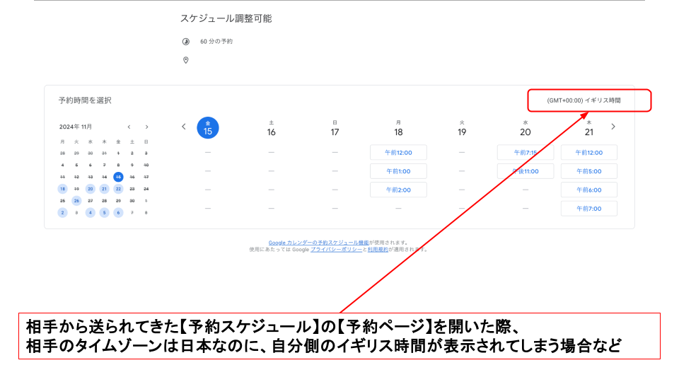 たとえば取引先からGoogleカレンダーの予約スケジュール機能を使った予約ページが送られてきたとして、相手は日本にいるのに自分のタイムゾーンはイギリスのため表示されている時間がズレてしまう、相手の時間で予定を設定したい、といった状況を仮定します。