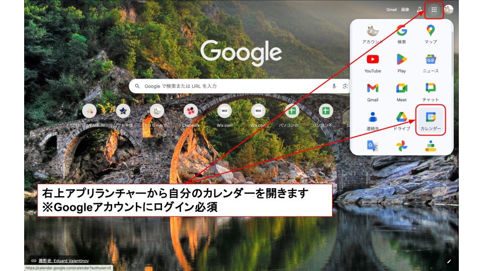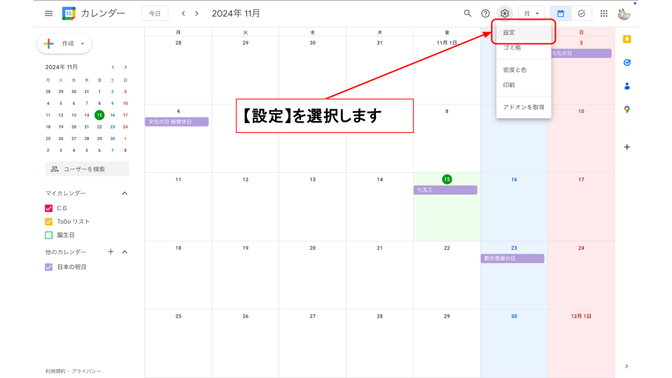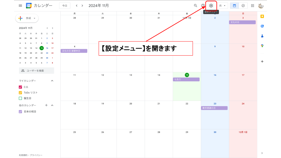 まずは自分のGoogleカレンダーを開きます。>>Googleカレンダー