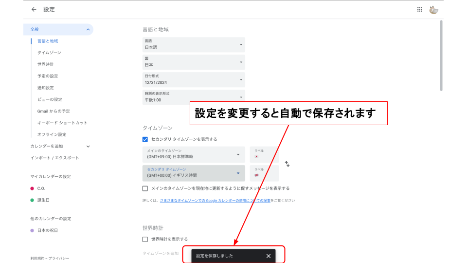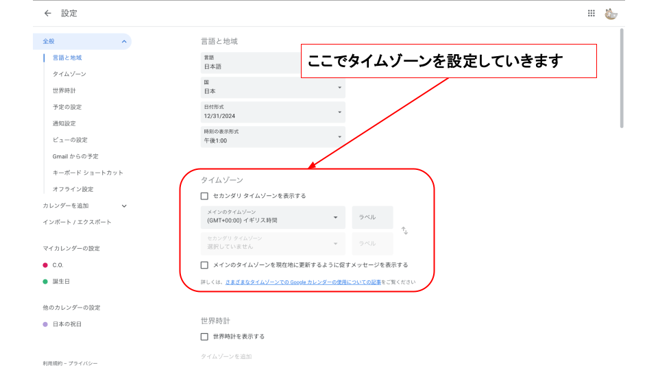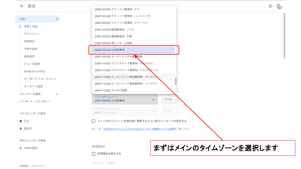 ※シンプルにGoogleカレンダーのタイムゾーンを設定したいだけの場合でも操作は同じです。