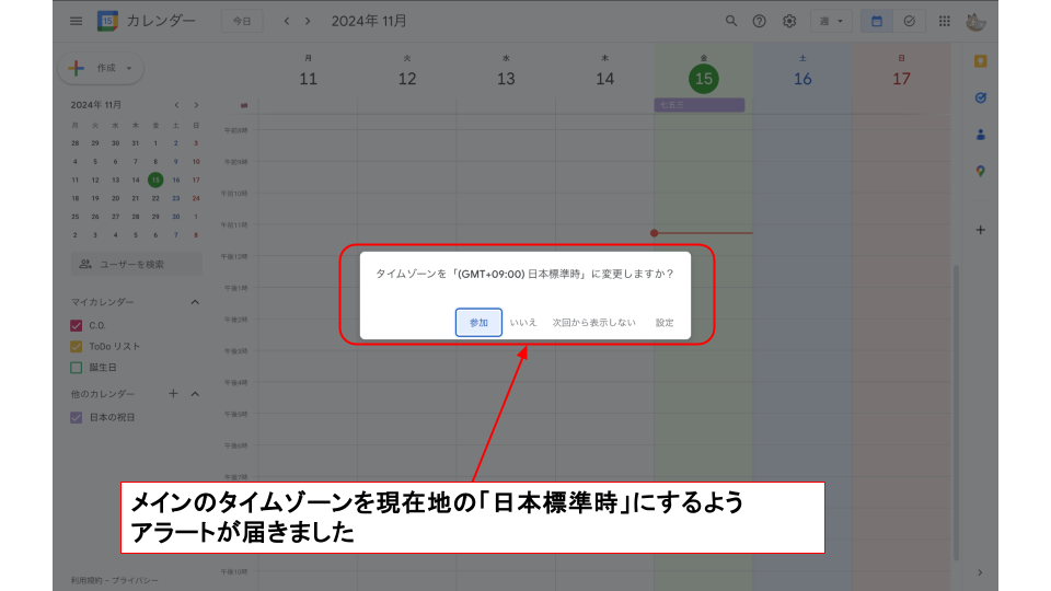 本来は日本いるため、タイムゾーンを変更するようにアラートが届きました。