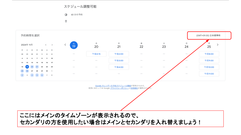 予約ページを開いた際、右上に表示されるタイムゾーンは”メイン”に設定しているタイムゾーンです。