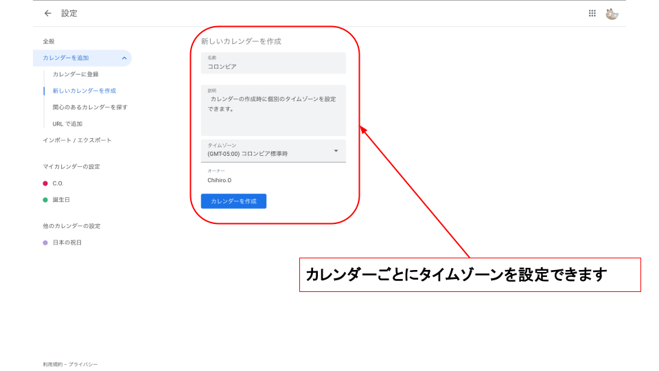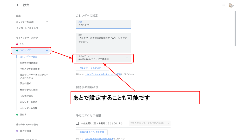 カレンダーごとにタイムゾーンを設定できます。タイムゾーンをコロンビアに設定し、わかりやすいようにカレンダー名も「コロンビア」にしました。