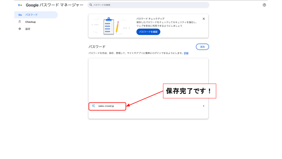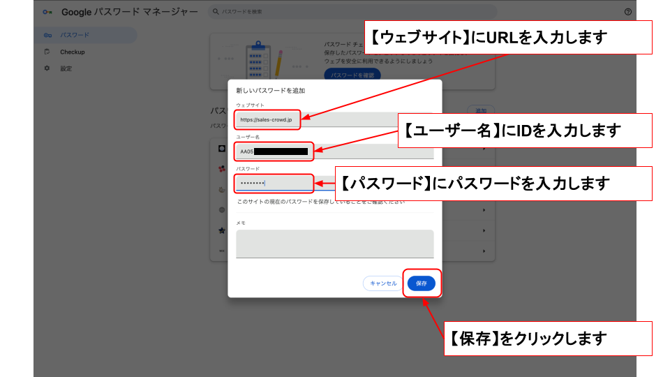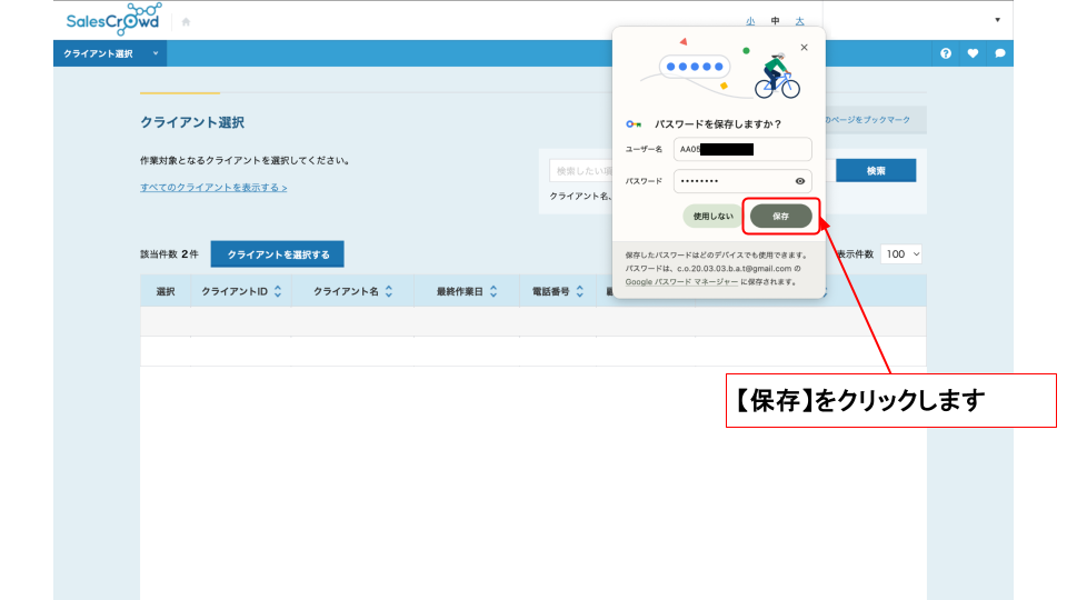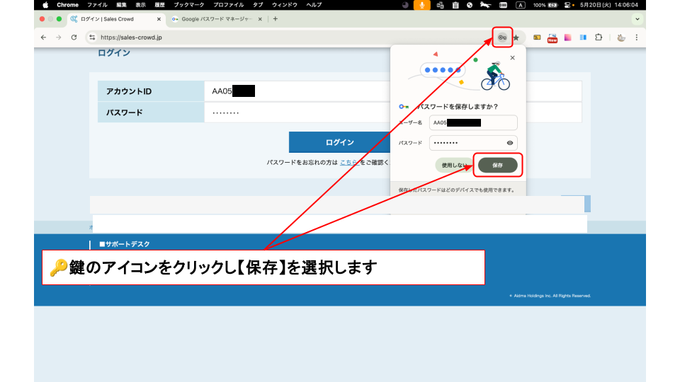 ログイン後、右上に【パスワードを保存しますか?】というポップアップが表示されたら【保存】を選択する、という手順でもOKです。