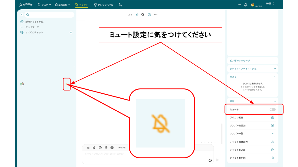 チャットごとのミュート設定に気をつけましょう! 不要な場合はOFFにしてください。