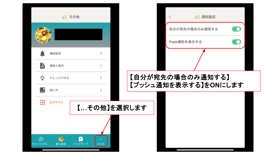次にメンバーズアプリを開き、下のメニューバーから【…その他】をタップして、【自分が宛先の場合のみ通知する】【プッシュ通知を表示する】をONにしたら完了です。