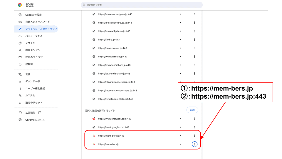 また、それでも改善しない場合はキャッシュクリア、(Chrome内の)メンバーズのデータを削除してから再度開き直してみてください(ただし、同時に権限もリセットした場合は再度「メンバーズに通知を許可しますか?」に対して「許可」を選択する必要があります。細かな手順はこの資料内で行う通知設定とまったく同じです)。