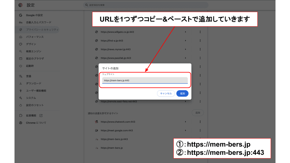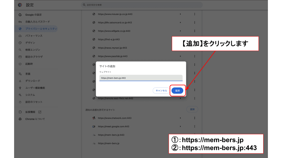 「通知の送信を許可するサイト」の隣にある「追加」をクリックします。