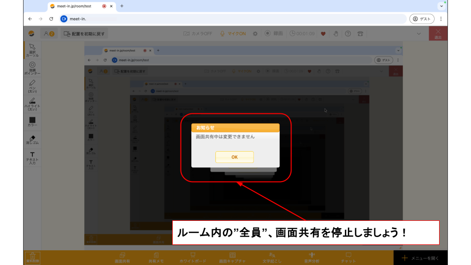 他にもCPUの使用率が高すぎていたり(スペック不足)、ネット環境が不安定(または速度不足)であったりしても同様の不具合が発生します。 - 何度クリックしても画面共有を開始することができません・・・