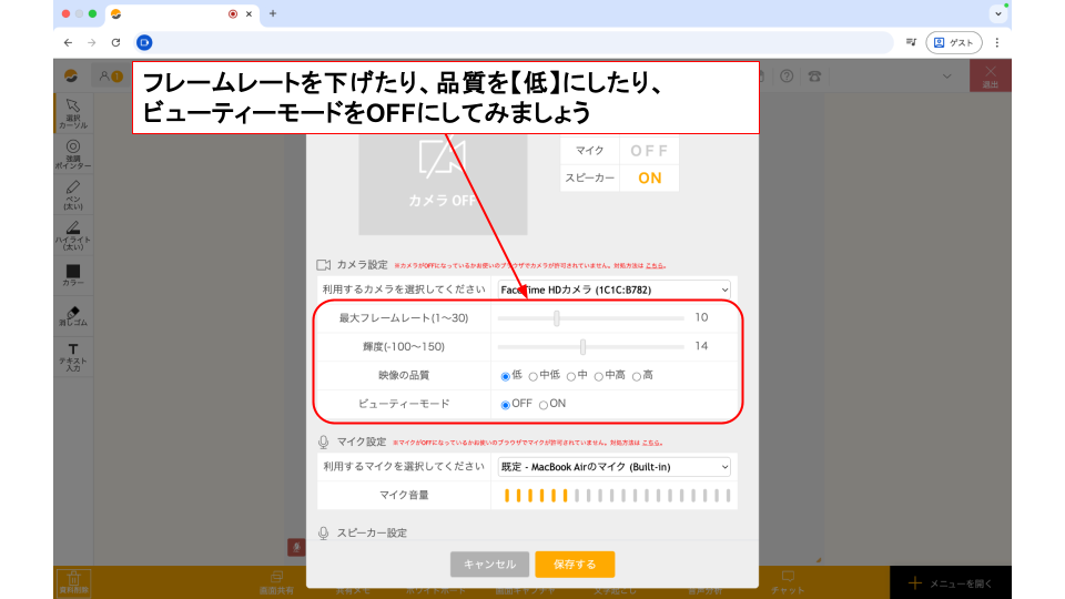 それでも改善しない場合はmeet inの設定を開いて【フレームレート】を下げたり、【品質】を”低”にしたり、ビューティーモードをOFFにしてみましょう。
