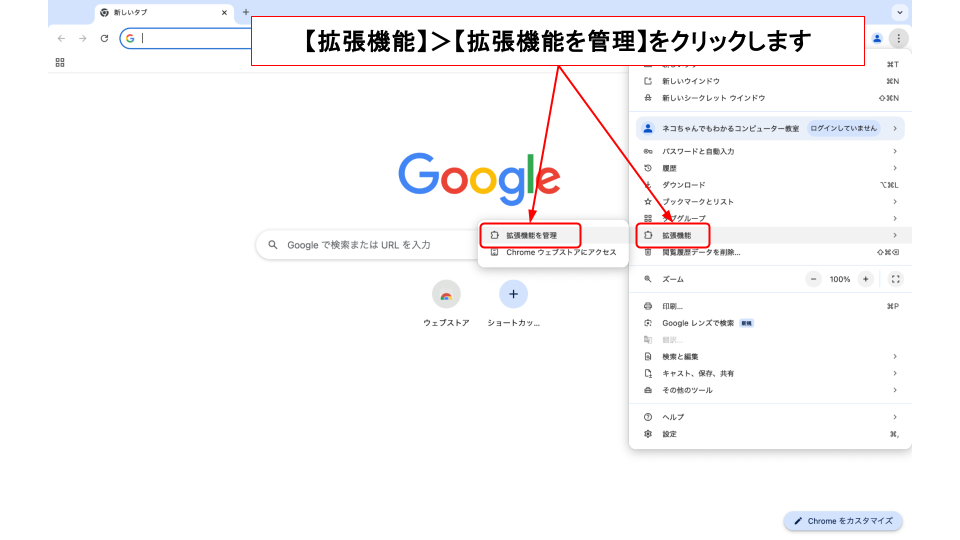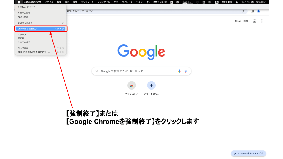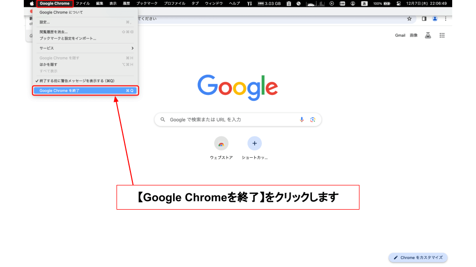 Google Chromeのウィンドウを開いた状態でメニューバーから「Google Chrome」>「Google Chromeを終了」をクリック
