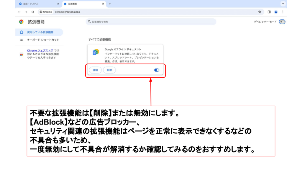 不具合が起きた際に「無効」「削除」すべき拡張機能