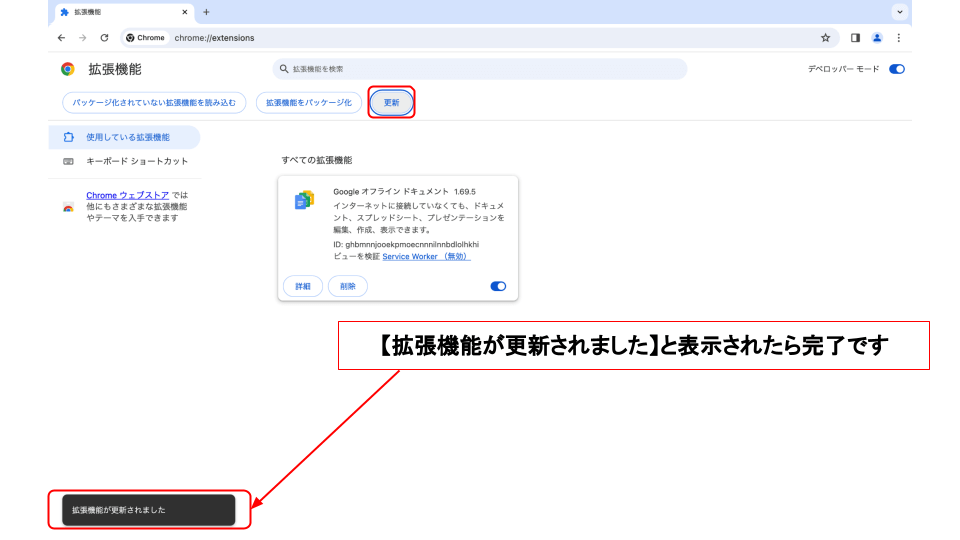 拡張機能が一覧表示されている上に「更新」ボタンが出てきたらそれをクリックします。「拡張機能が更新されました」と出たらOKです!