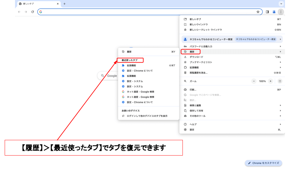 「履歴」にマウスのカーソル(画面の中で動く矢印)を合わせると「最近閉じたタブ」が一覧で表示されるので、復元したいものを選択してクリックすればOKです!