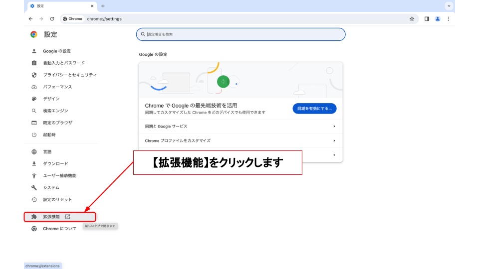 【拡張機能】から【設定】のタブに戻り、【 Chromeについて】をクリックします。