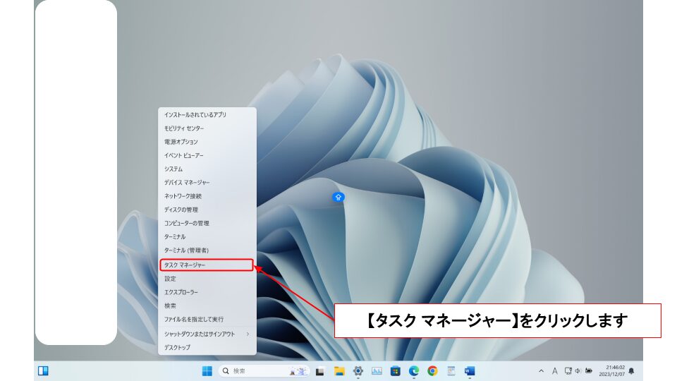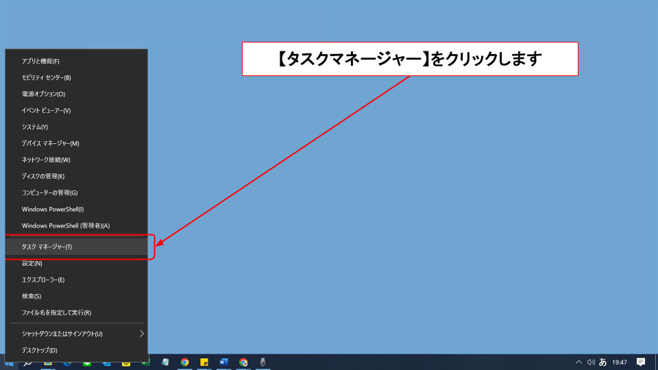 スタートボタンを右クリックして「タスクマネージャー」を左クリックします。