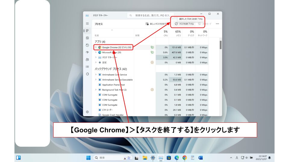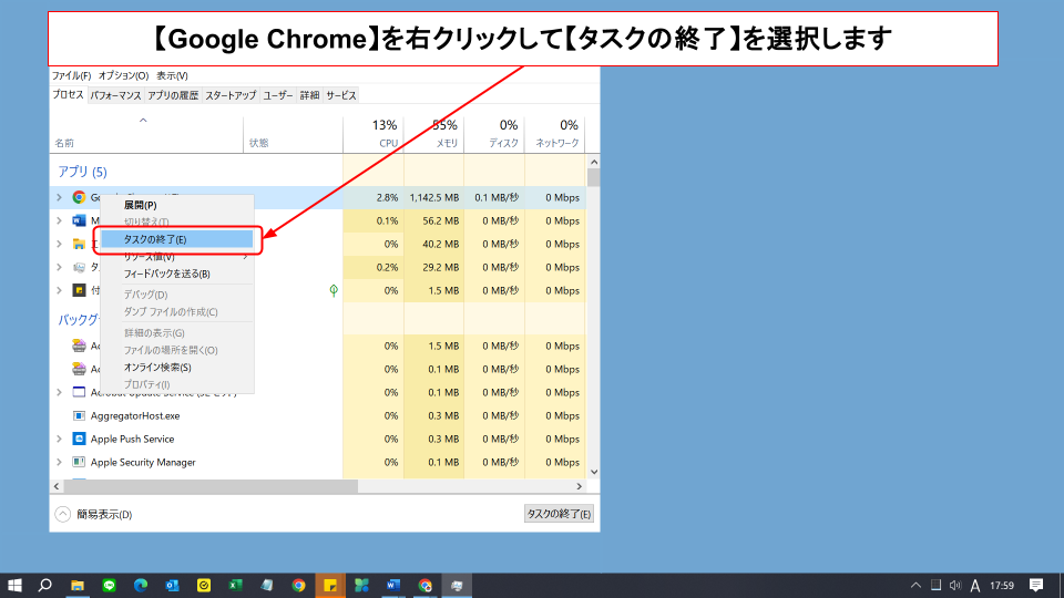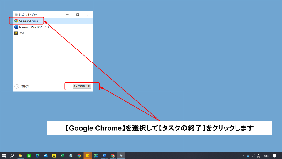 「Google Chrome」を右クリックして「タスクの終了」を選択する方法でも大丈夫です!
