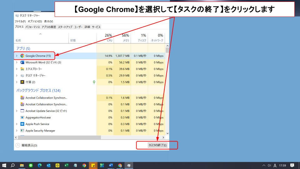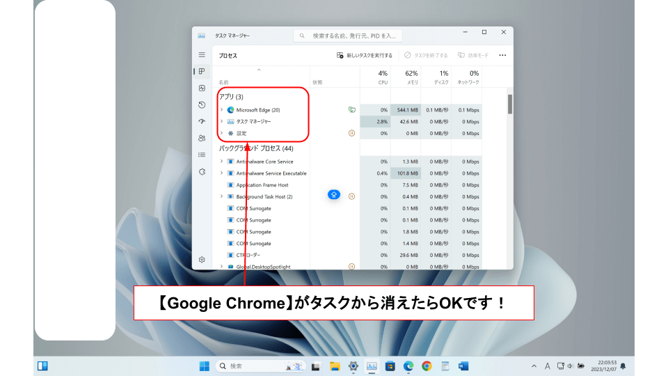 「Google Chrome」を選択した状態でウィンドウ右下「タスクの終了」をクリックします。【タスクの終了】をクリックし、「アプリ」一覧から「Google Chrome」が消えたら完了です。