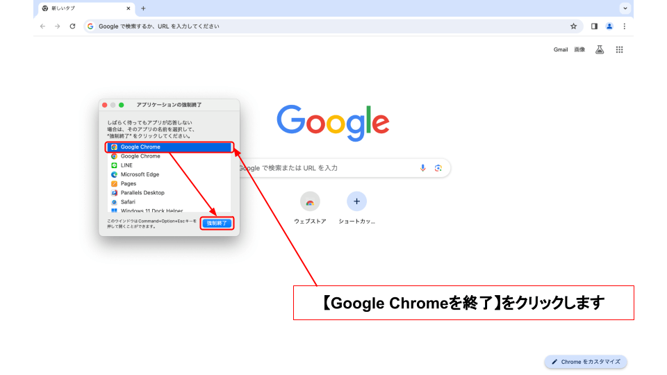 Appleのアイコンをクリック⇒「強制終了」⇒「Google Chrome」を選択した状態で青い「強制終了」のボタンをクリック
