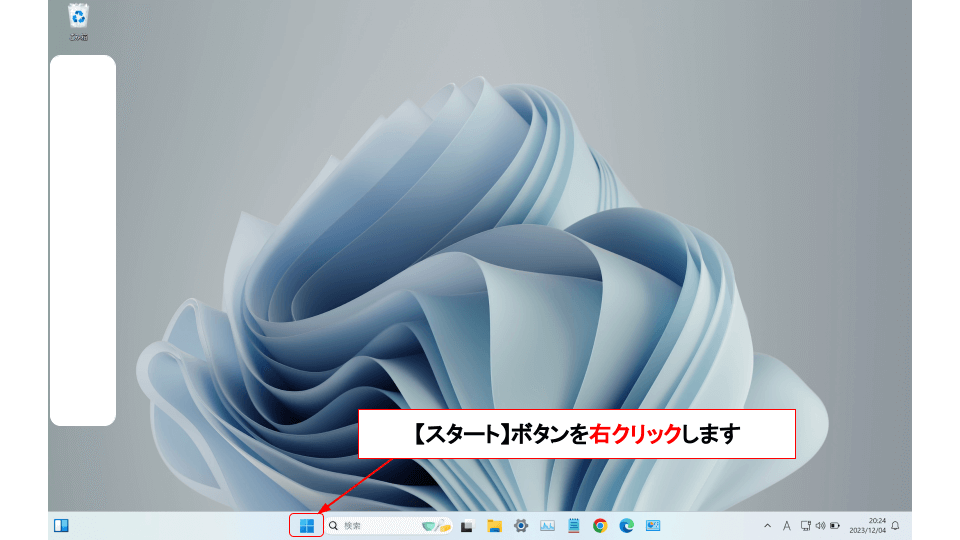 スタートボタンを右クリックします。Windowsのロゴと同じ形のアイコンです。