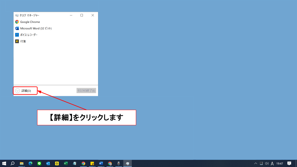 ※簡易表示でも「Google Chrome」を選択して「タスクの終了」でこの作業を完了させることができます。