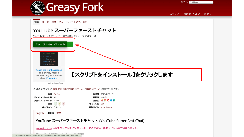 また、チャット欄を開く/閉じることでエラーが出ている場合は拡張機能のTampermonkeyをインストール後、さらにYouTube スーパーファーストチャットのスクリプトをインストールしてください。方法はこの章を確認してください。>インストール