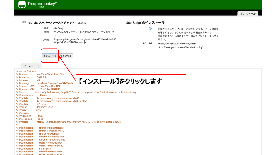 Tampermonkeyのインストール>YouTube スーパーファーストチャットのスクリプトを追加する方法、Adblockを無効にする方法も画像付きで記載しています!